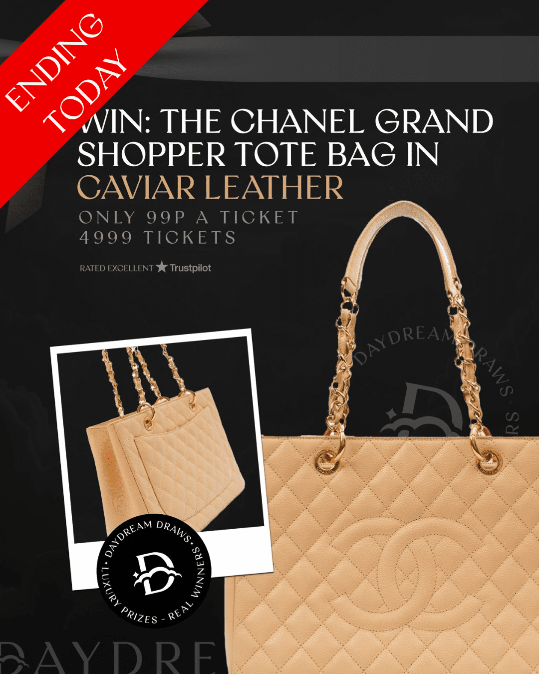 Win Chanel Grand Shopper Tote (GST) in beige Caviar Leather. This very popular chain tote is sadly now discontinued and only available to buy preloved. Great opportunity to own a practical, iconic and sophisticated Chanel bag. Perfect for day or evening use and the caviar leather is very resilient and durable. Can be carried in the crook of the arm or over shoulder using the chain straps.
